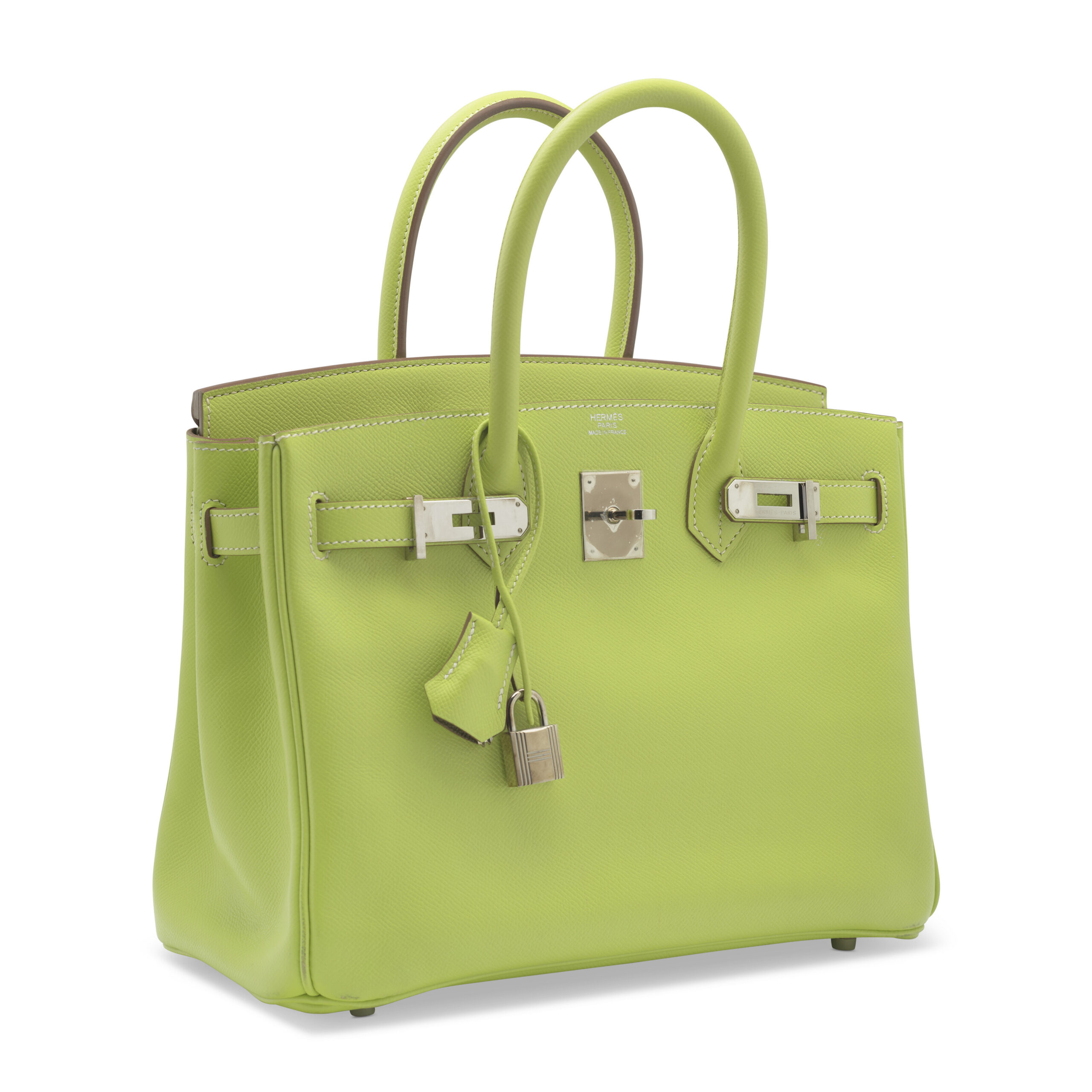 The centerpiece is a pristine Birkin 30 in the mesmerizing Kiwi and Lichen duo-tone. Crafted from resilient Epsom leather, its structured silhouette showcases a stunning gradient from a vibrant green to a soft, earthy grey-green. The clean lines are accentuated by gleaming Palladium hardware, offering a cool, contemporary contrast. This specific combination—Epsom leather with Palladium—is celebrated for its durability and sophisticated sheen, ensuring the bag maintains its impeccable shape for a lifetime.