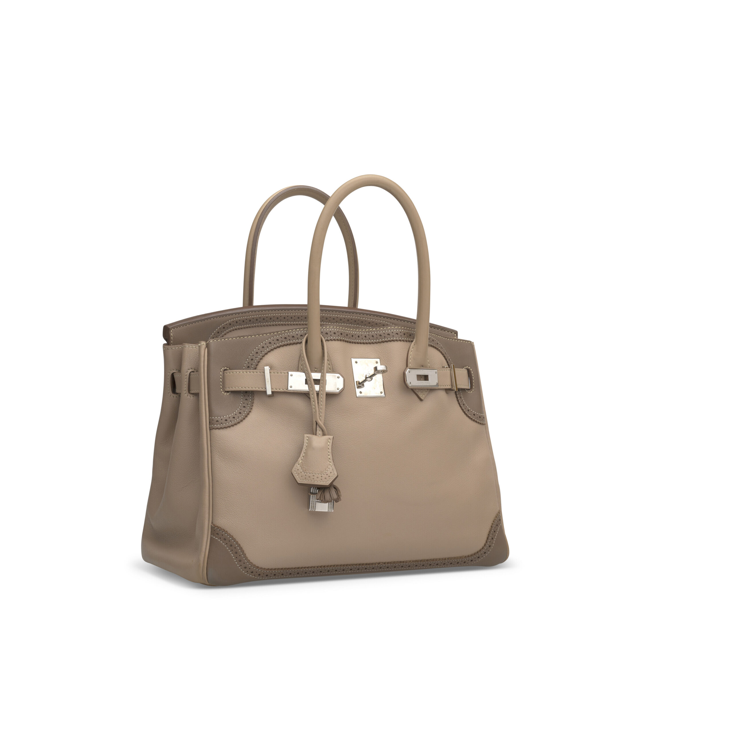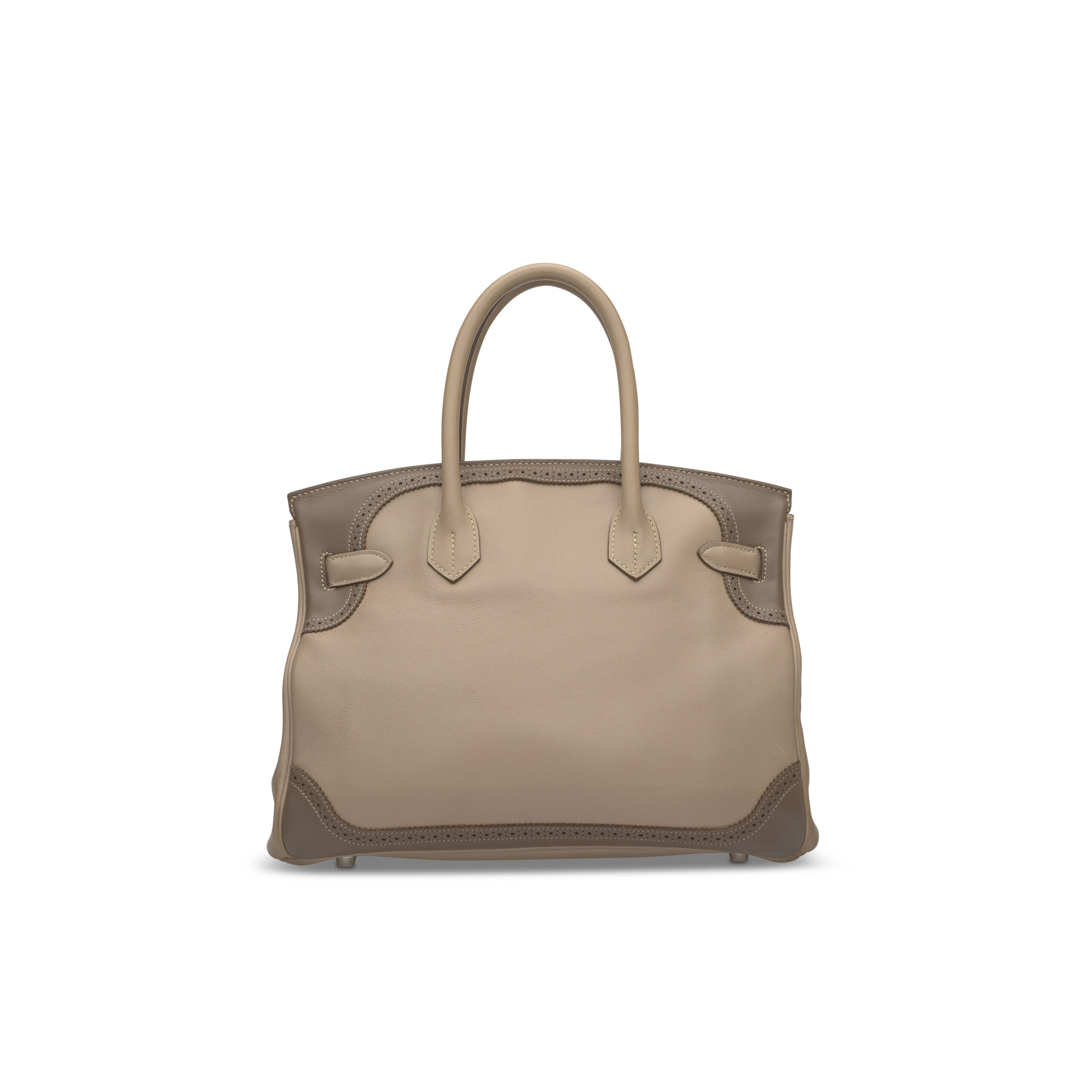 The Ghillies perforation is a marvel of Hermès craftsmanship. Each tiny hole is meticulously punched by skilled artisans, a process that requires immense precision to ensure structural integrity and aesthetic perfection. This technique adds a layer of breathtaking texture and lightness to the robust Birkin form. The two-tone design is executed with seamless precision, where the Argile body meets the Étoüpe flaps, handle, and trim, creating a sophisticated, modern contrast. The 30cm size offers perfect proportions for daily elegance, being spacious yet impeccably balanced.