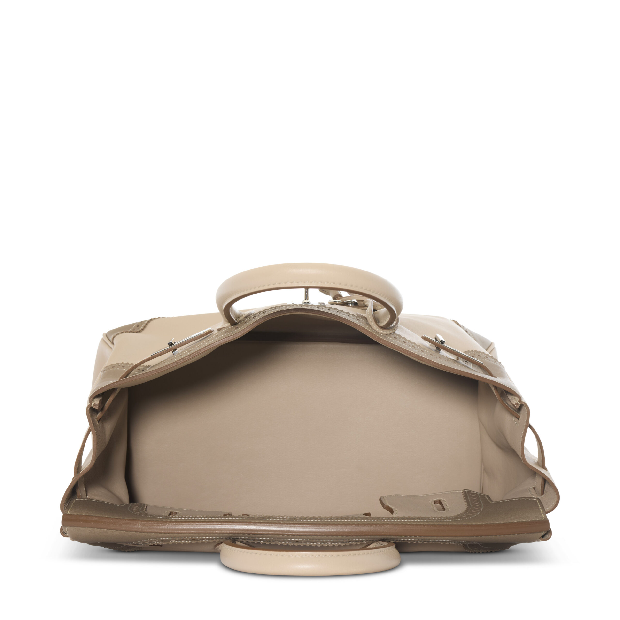 The choice of Swift leather is paramount to this bag’s character. Renowned for its smooth, fine-grained surface and soft, pebbled texture, Swift absorbs color with a luminous depth, allowing the gentle, neutral tones of Argile and Étope to shine with a creamy, almost velvety richness. This leather’s pliable nature makes the Ghillies perforations—a signature technique inspired by traditional men’s dancing shoes—exceptionally refined.