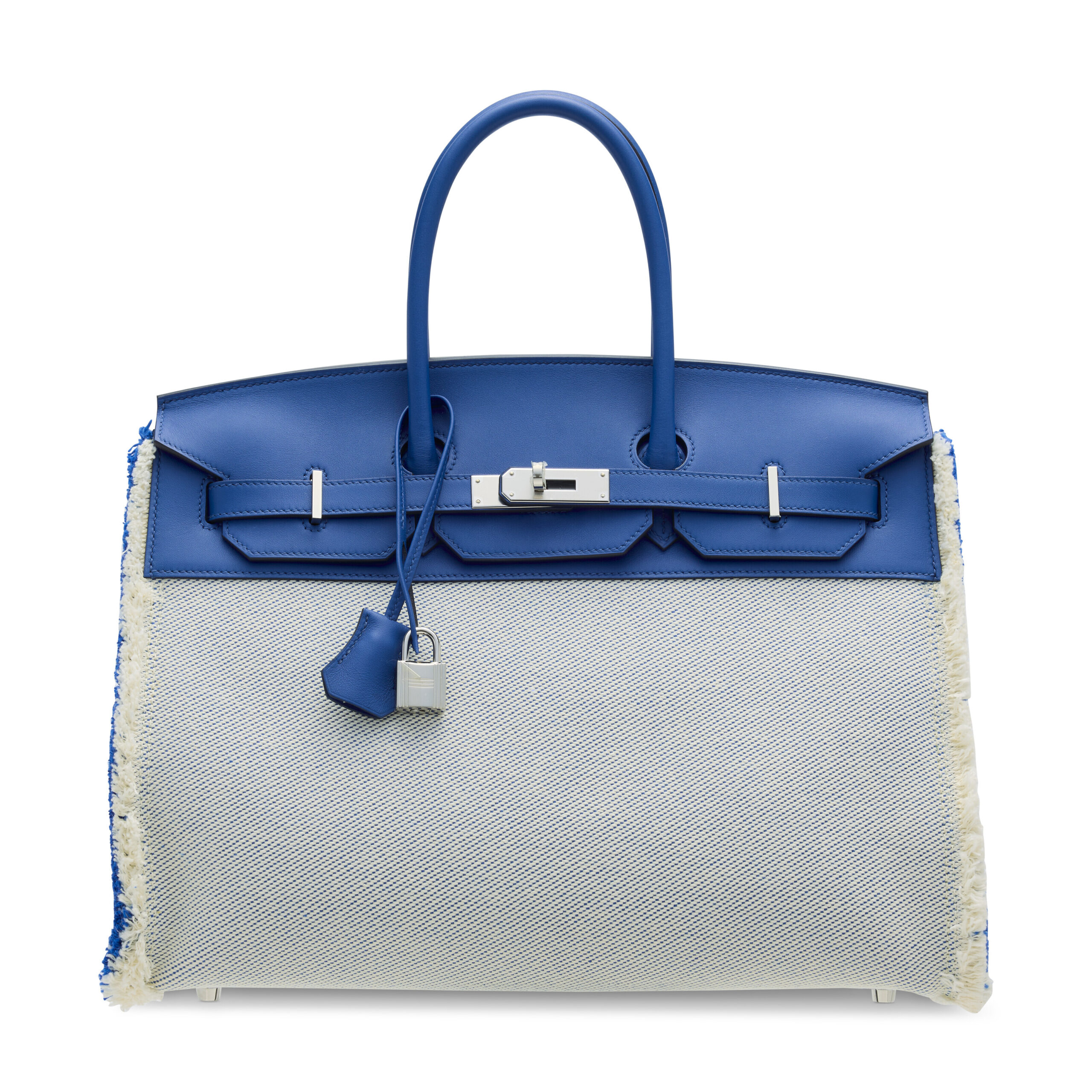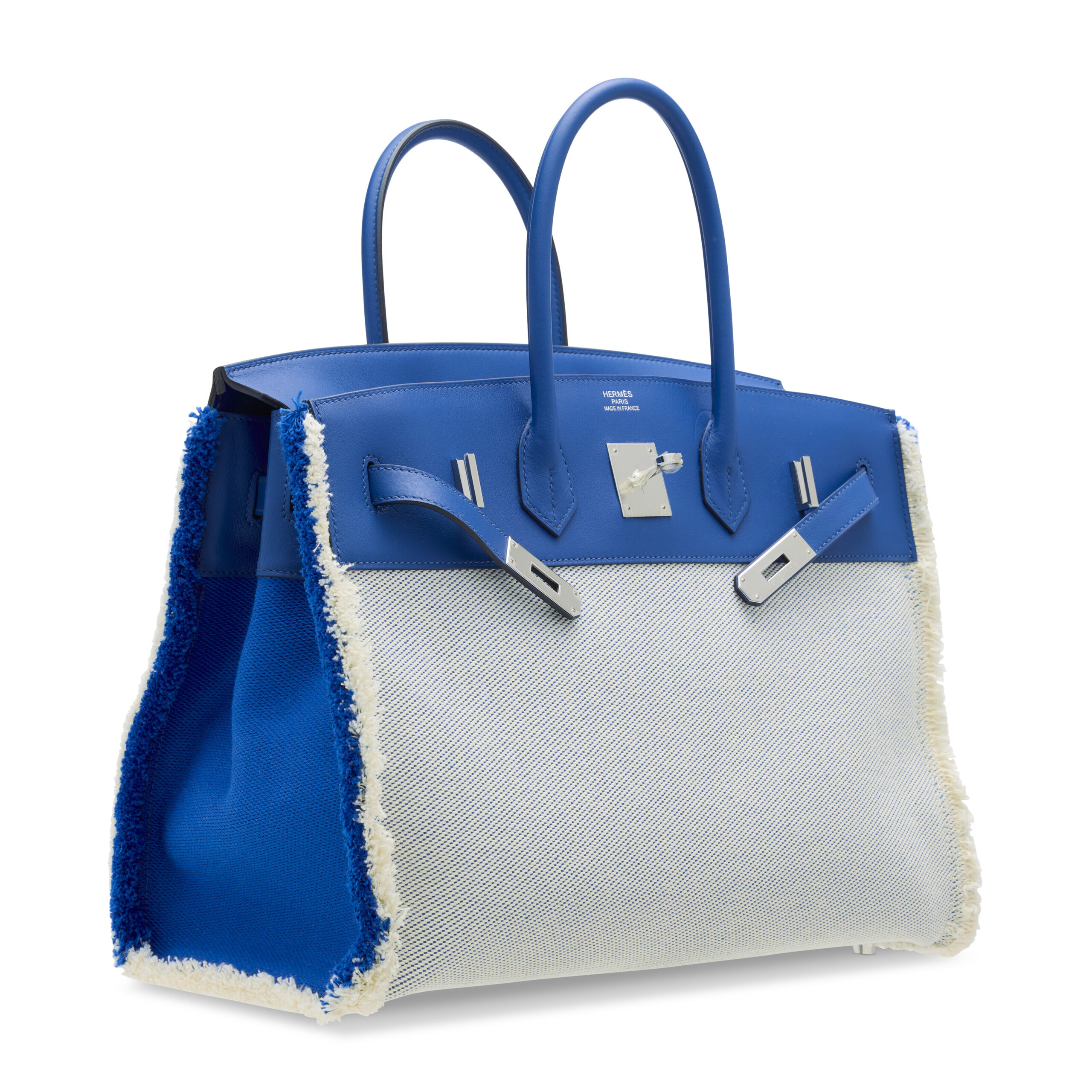 The genius of this special order piece lies in its contrasting yet harmonious materials. The sumptuous Bleu de France Swift leather provides a pool of rich, saturated color, known for its supremely soft and pebbled finish that develops a beautiful patina over time. This is elegantly paired with the rugged, natural appeal of écru Toile H canvas, a durable and iconic fabric deeply rooted in the brand’s heritage. The “Fray Fray” appellation comes to life in the meticulously unraveled edges of the canvas, an intentional design flourish that adds an element of avant-garde texture and casual sophistication rarely seen in Birkin craftsmanship.