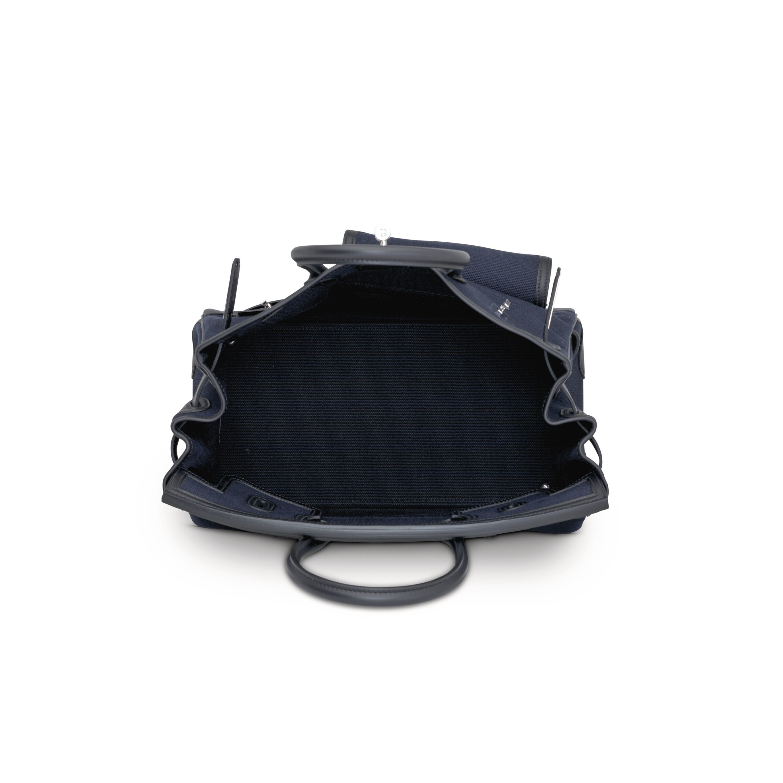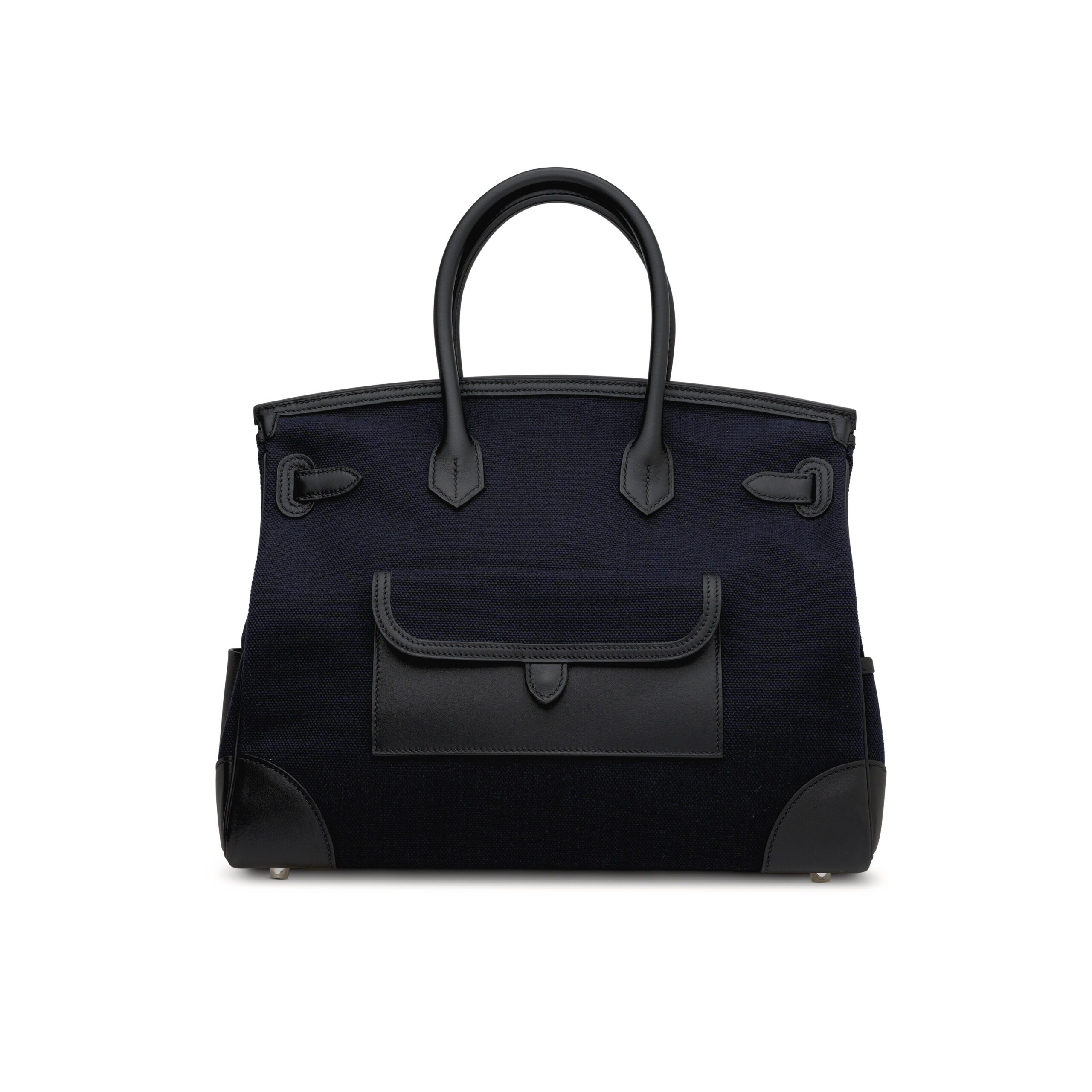 Hermès’ legendary commitment to material excellence is on full display. The structured body is crafted from durable, nautical-inspired Bleu Marine canvas, a technical fabric offering remarkable scratch-resistance and a rich, tonal depth. This is elegantly contrasted with the supple embrace of Black Swift leather on the gussets, handles, and signature flap—a leather prized for its fine grain and soft, pebbled texture. The marriage of these materials creates a stunning visual duality: the robust, carefree spirit of canvas meets the timeless, tactile luxury of leather.