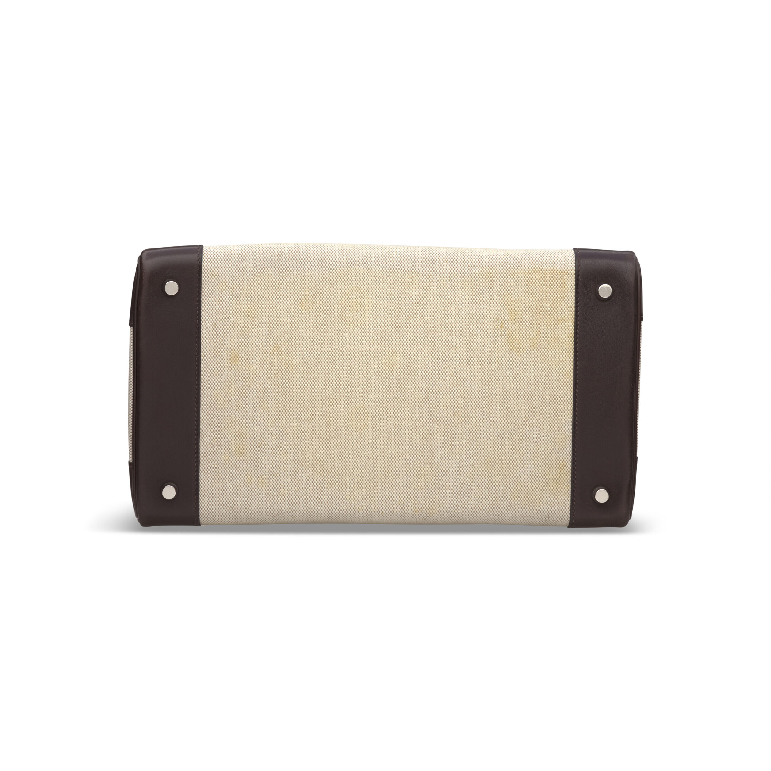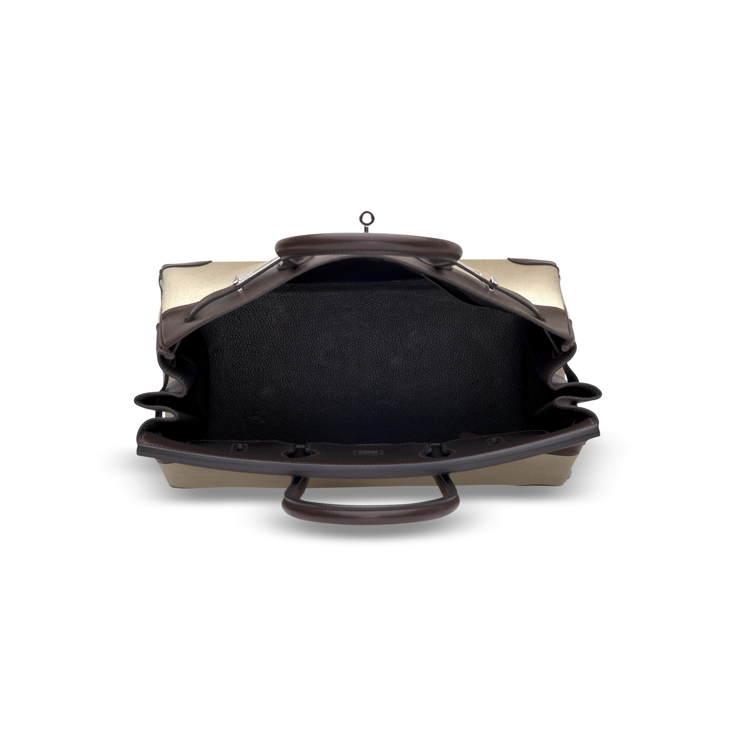 The soul of this piece lies in its deliberate material dialogue. The rich, almost-black Ébène Evercalf leather provides a soft, pebbled foundation that is exceptionally durable and develops a unique patina over time. This is elegantly framed and accented by a robust, beige-toned canvas, a material choice that recalls heritage travel trunks and injects a note of relaxed, modern ease. The palladium-plated hardware—from the iconic sangle and plaque to the tourniquet and feet—offers a sleek, silver-toned finish that complements the bag’s neutral palette without competing for attention. Each stitch, a hallmark of Hermès savoir-faire, is meticulously placed by a single artisan, ensuring unparalleled structural integrity.