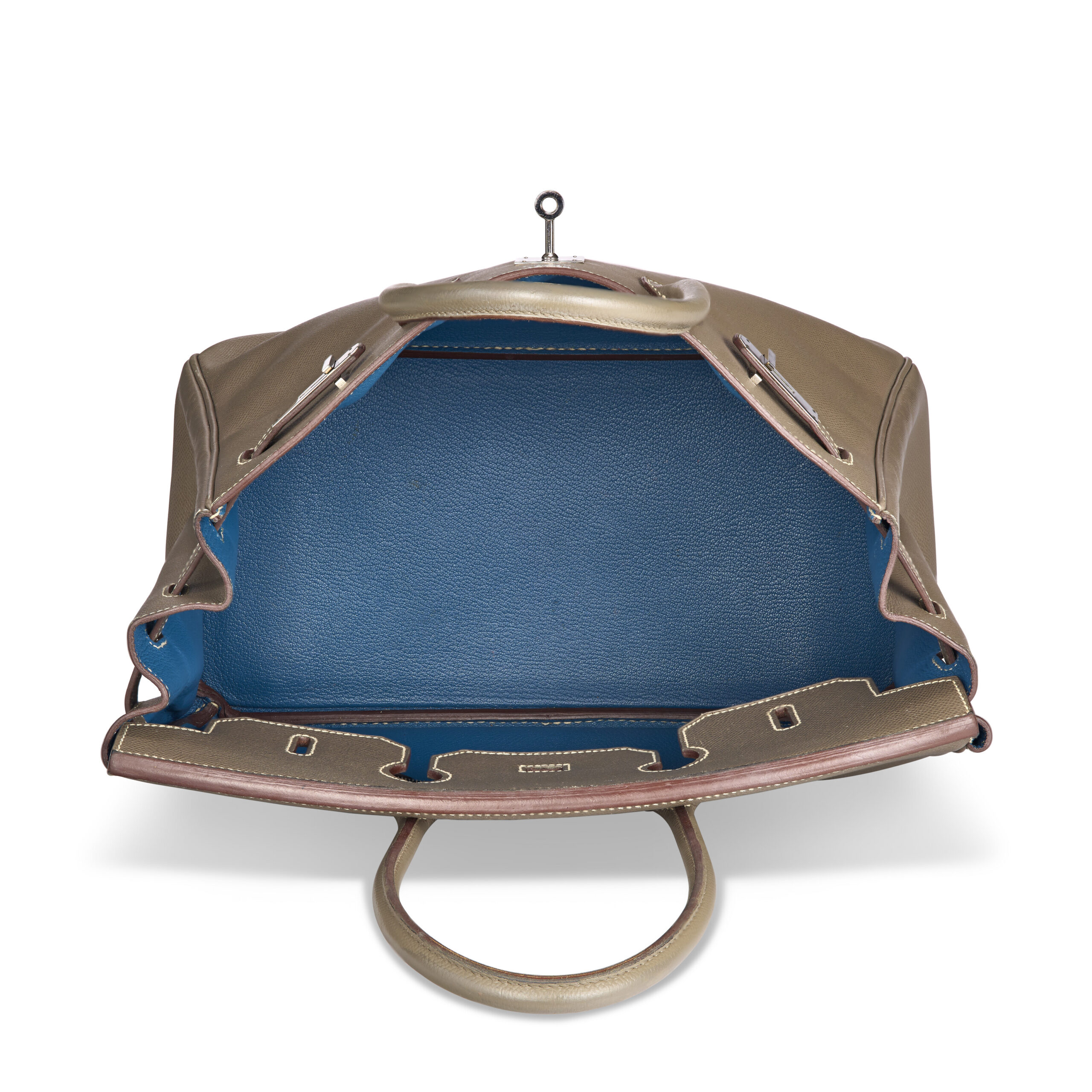 The genius of this Birkin lies in its captivating two-tone construction. The cool, sophisticated grey of Étain forms the structured body, perfectly contrasted by the vibrant, oceanic splash of Bleu Thalassa on the signature flap, straps, and gussets. This bold color-blocking is rendered in durable, scratch-resistant Epsom leather, chosen for its ability to maintain a pristine, sculptural silhouette over time. The entirety is accented with luminous Palladium Hardware, whose cool, polished silver tone complements both hues without overshadowing them, creating a harmonious and modern aesthetic.
