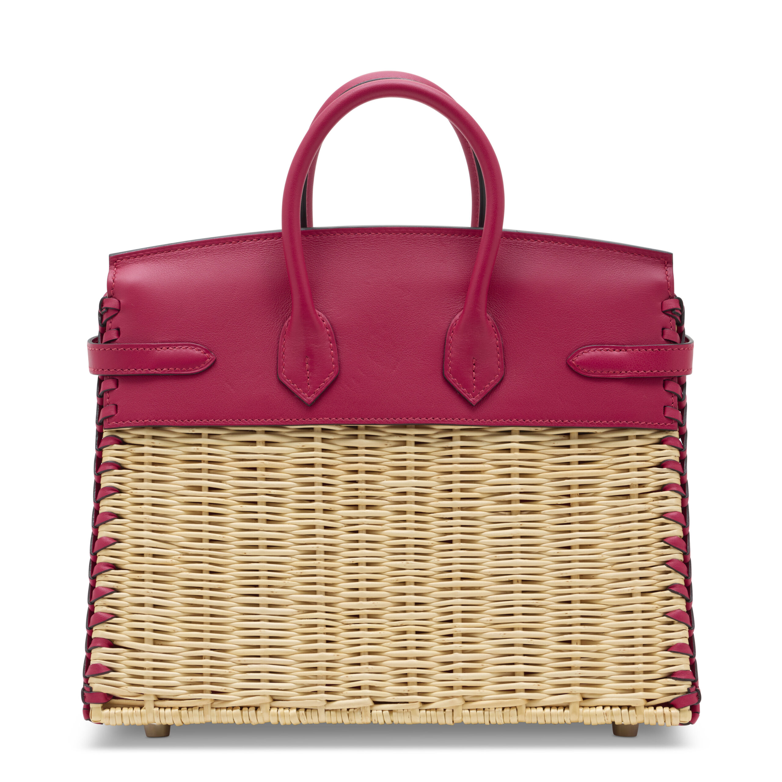 Beyond its materials, this Birkin tells a story of deliberate, joyful design. The framboise color is both playful and sophisticated—a shade that commands attention while retaining timeless appeal. The osier panels are not mere embellishments; they represent hours of handwork, each strip carefully selected and woven to ensure durability and aesthetic harmony. This Picnic variation transforms the structured Birkin form into something lighter, both in visual weight and in spirit, evoking the leisurely elegance of a garden gathering or a summer soiree. The 25cm size ensures versatility, offering a compact yet proportionally perfect scale for both day and evening.
