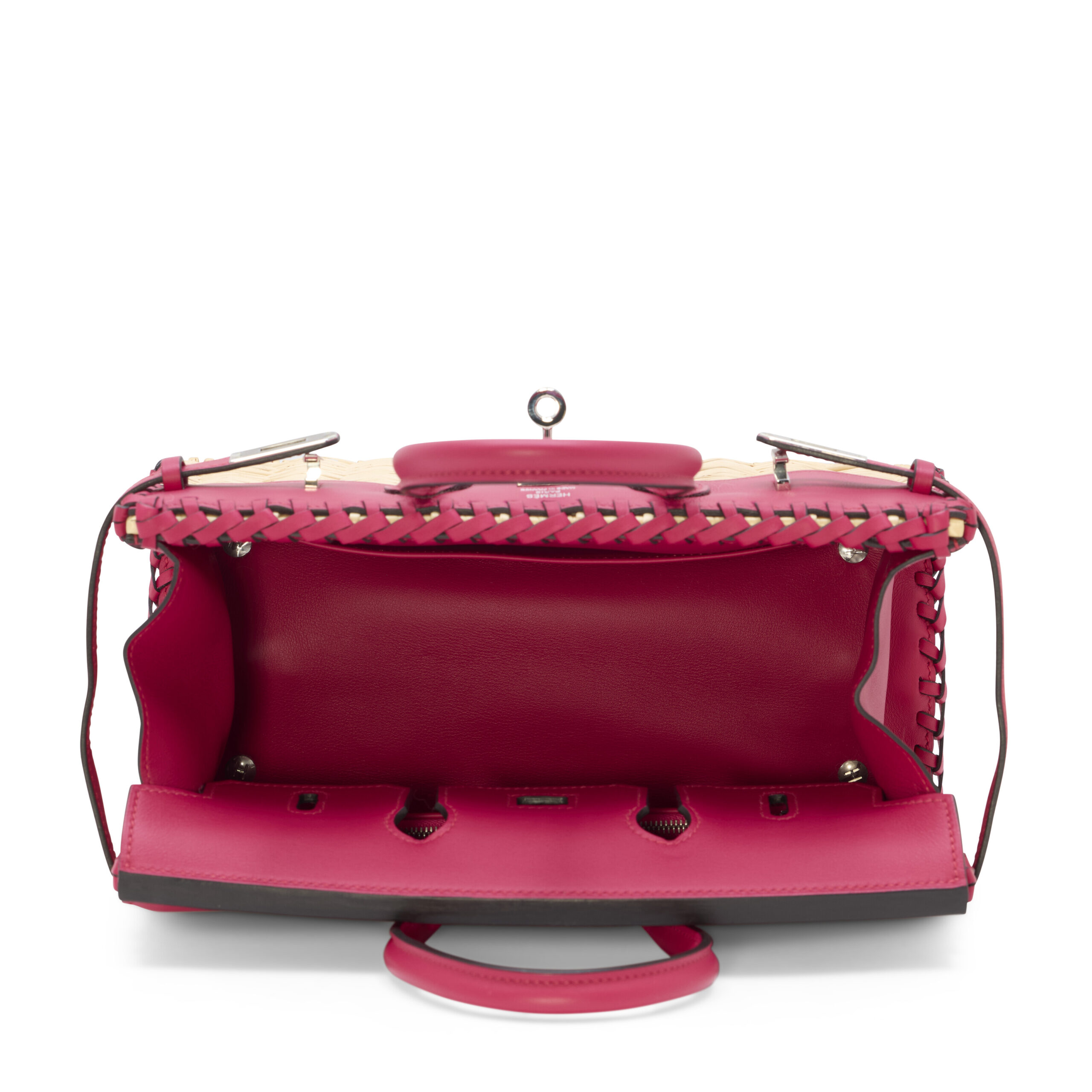 Hermès’s legendary commitment to materials is palpable in every detail. The Swift leather, known for its fine, smooth grain and vibrant color saturation, provides a lush, tactile foundation. Woven expertly into the body, natural osier—a basket-weaving technique rarely seen—introduces a dimension of organic craft and textural contrast. This harmonious blend of leather and woven wood speaks to Hermès’s heritage in saddle-making and artisanal innovation. The palladium hardware, with its soft, white-metallic sheen, complements the framboise tone without overpowering it, offering a modern, lustrous finish to the classic turn-lock and sangle straps.