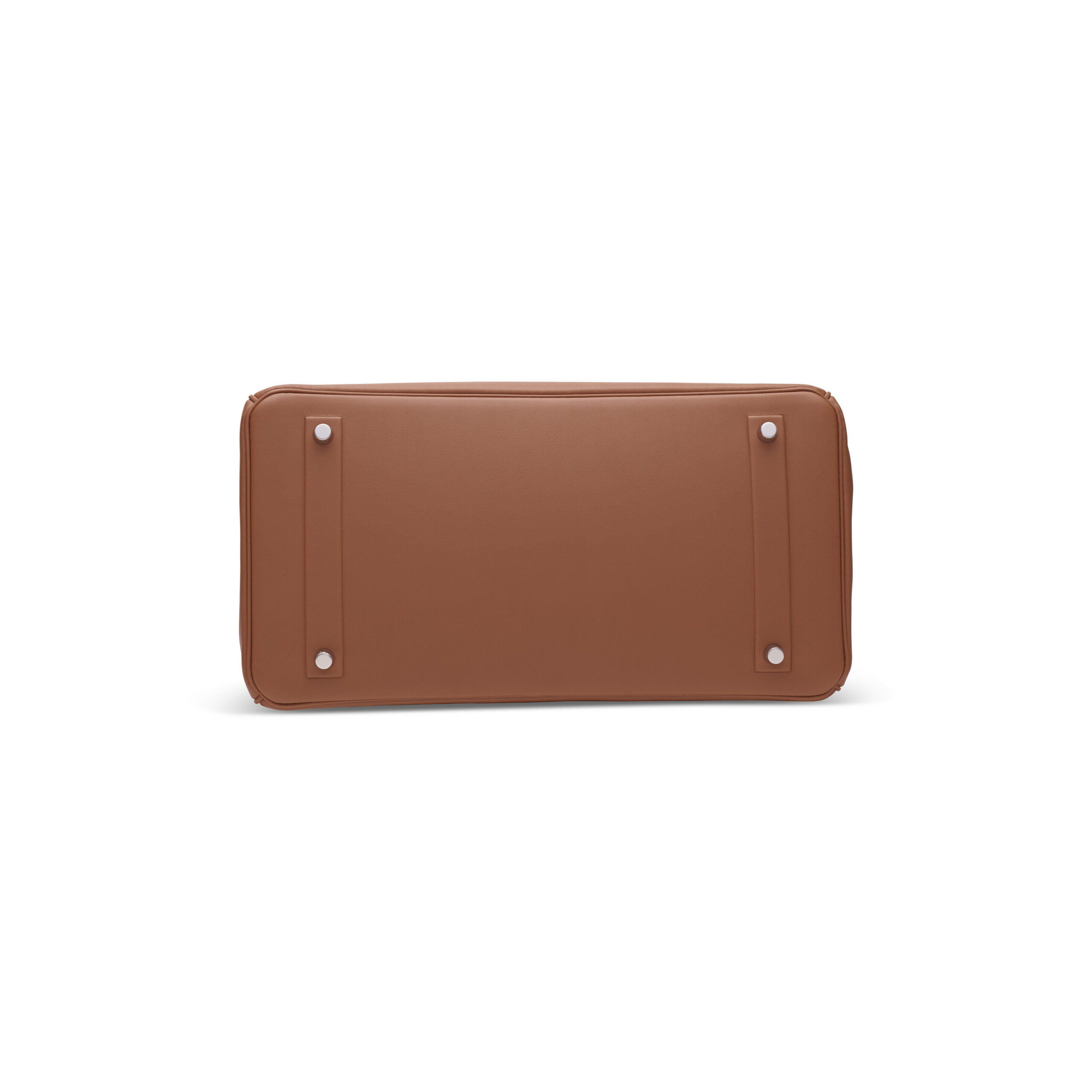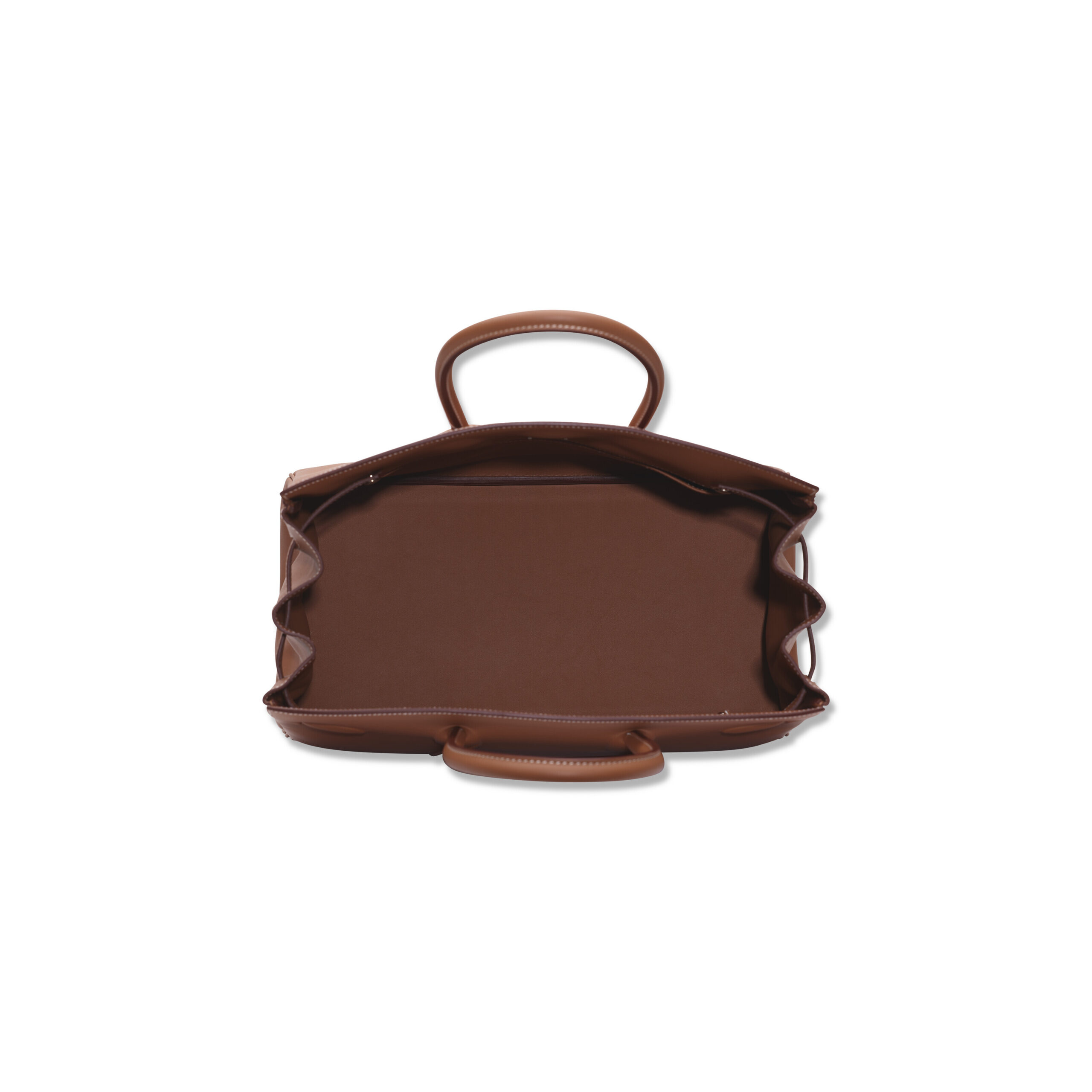 Complementing the warm Gold leather is a suite of gleaming palladium hardware. This rare, platinum-group metal offers a sophisticated, white-metallic sheen that is both highly durable and inherently luxurious. From the iconic plaque tournante (turnlock) to the fermoirs (strap hardware) and sabots (feet), each palladium element provides a modern, cool-toned contrast that highlights the bag’s architectural lines without competing for attention. It is a detail that underscores the collection’s contemporary spirit.