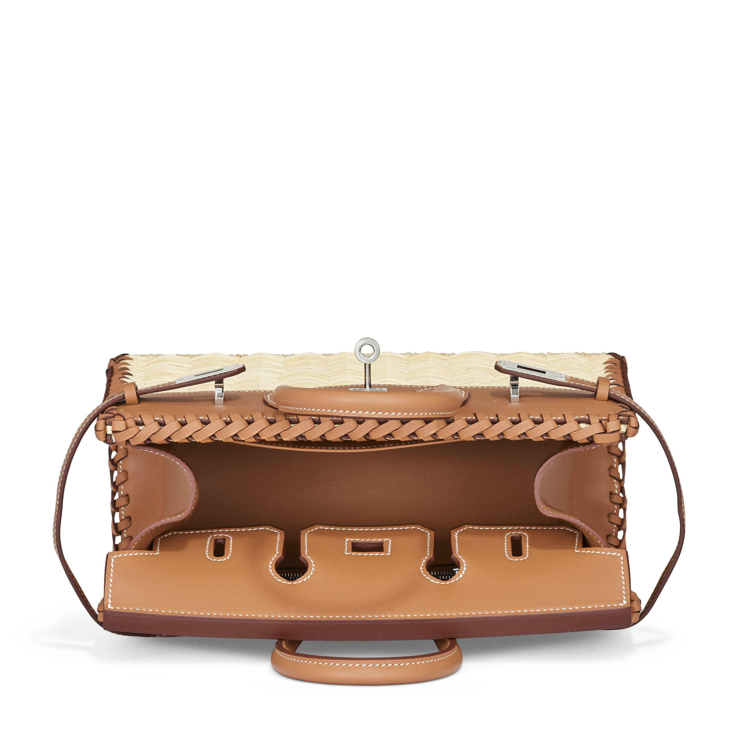 Every detail of this collector’s item speaks to a profound level of artistry. The supple Gold Swift leather, a hallmark of Hermès, provides a smooth, luminous base that contrasts beautifully with the textured, natural wicker paneling. This combination is a daring and celebrated design, requiring master artisans to meticulously integrate two disparate materials into a seamless, structurally sound whole. The cool gleam of the Palladium hardware—from the iconic sanglock closure to the feet and plaque—adds a modern, refined touch, ensuring the bag’s elegance remains unmistakably Hermès.