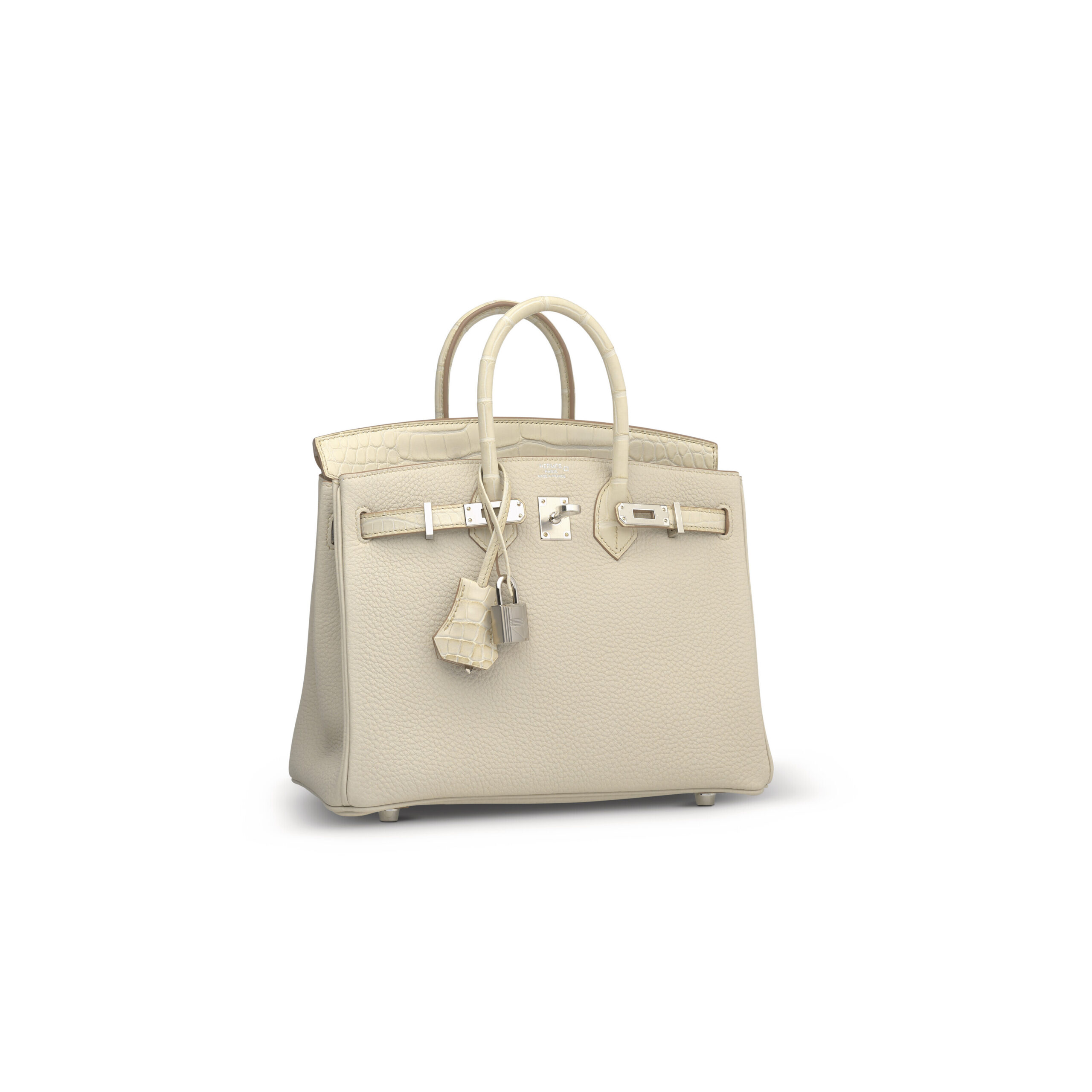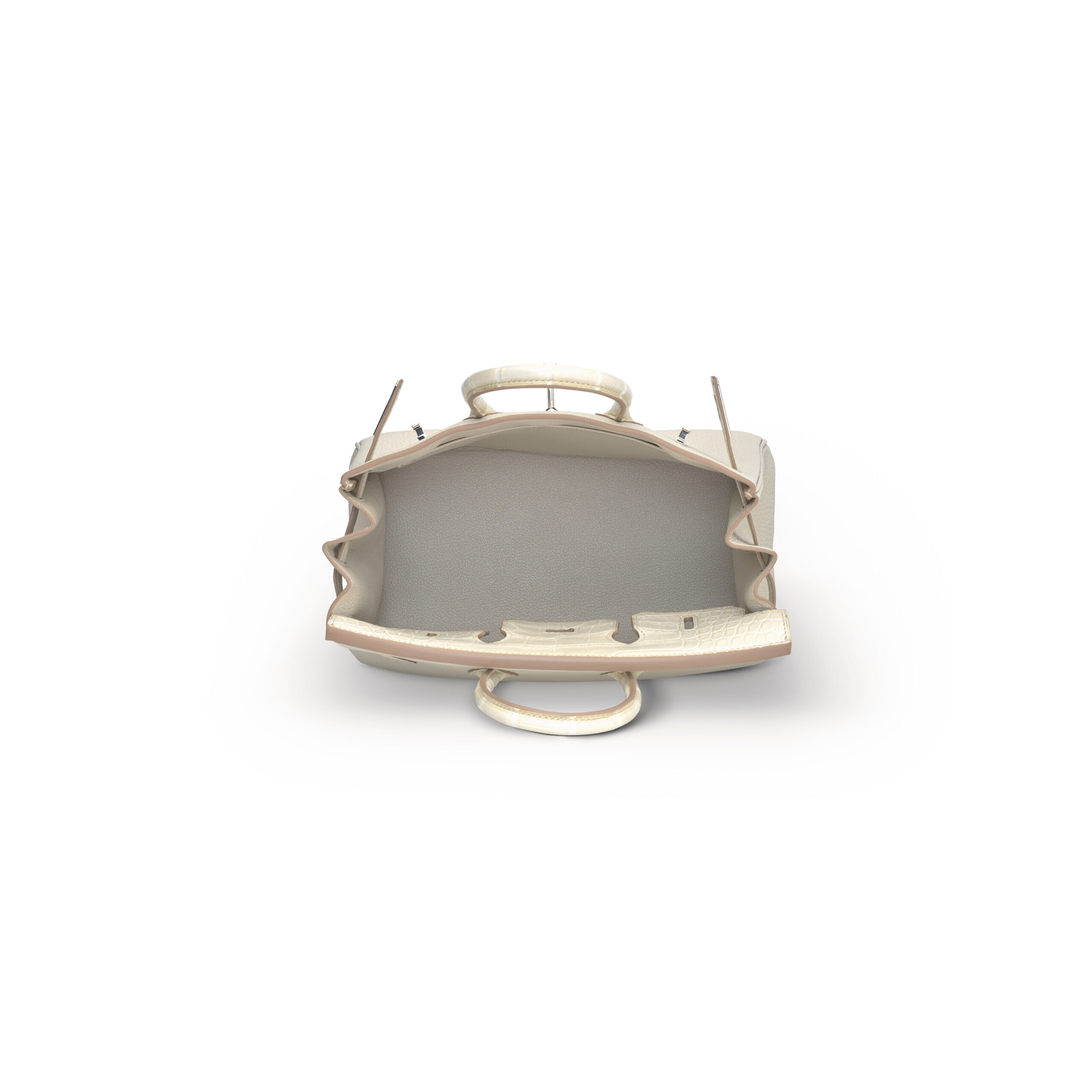 The design intelligence of this limited edition model is evident in every detail. The Palladium hardware—cool, contemporary, and highly scratch-resistant—provides a flawless metallic accent against the neutral leathers. From the iconic sangle (strap) and porte-clés (keyholder) to the tourniquet (turning lock plate), each piece of hardware is precisely applied, reflecting light softly. The 25-centimeter size is the modern goldilocks dimension, offering ample space for daily essentials while retaining an elegant, proportional scale. The strategic placement of the alligator panel ensures maximum visual impact, making this a piece that speaks quietly but carries immense presence.