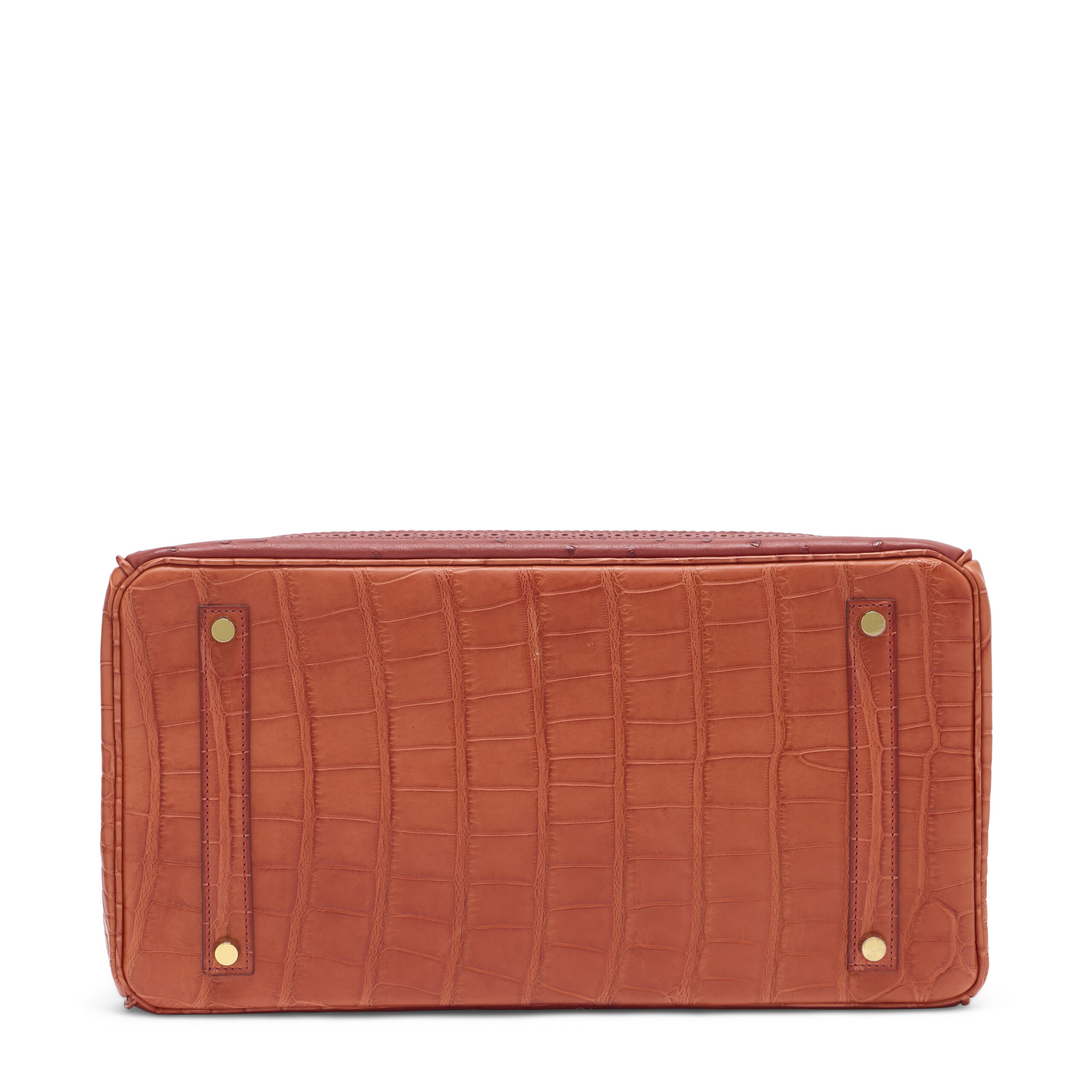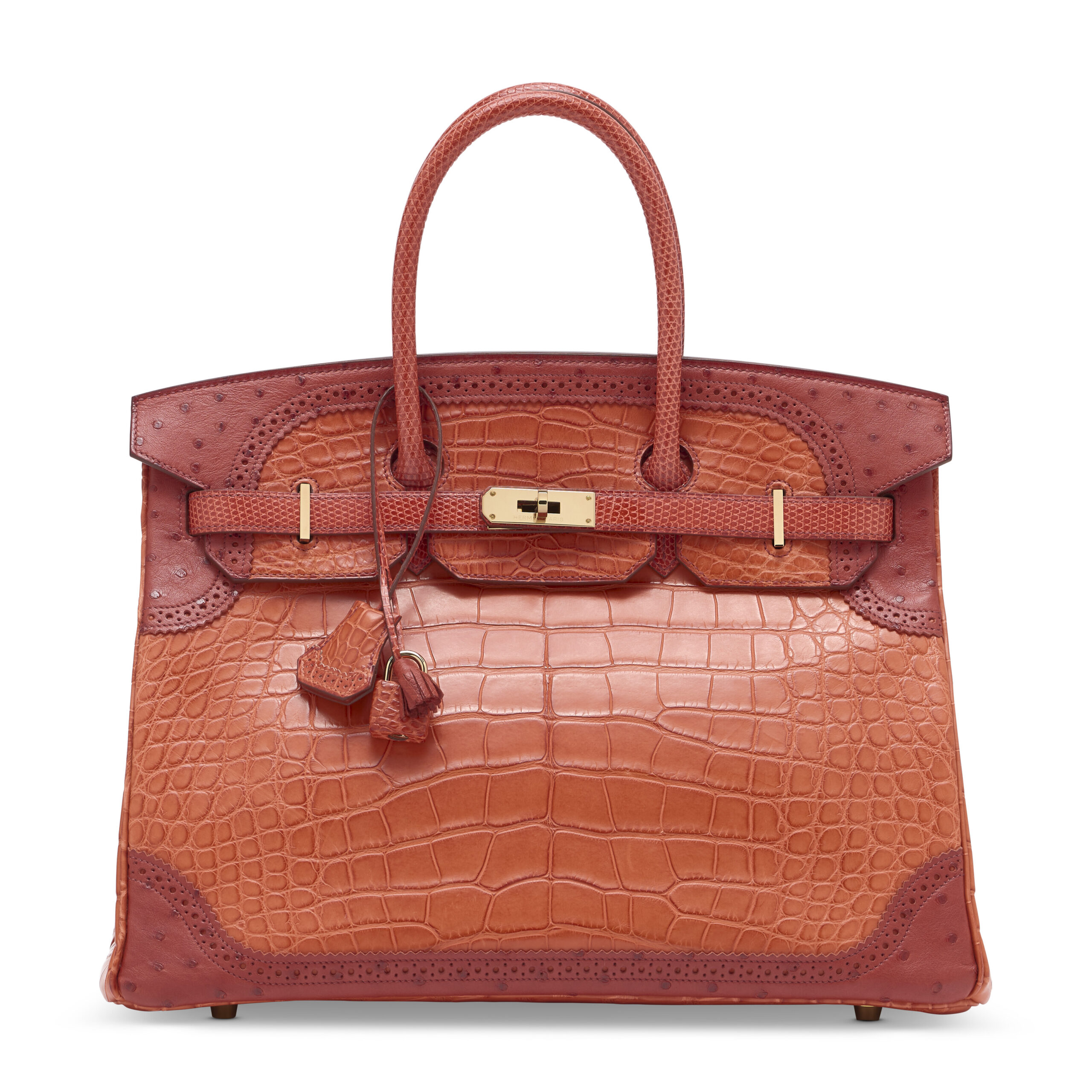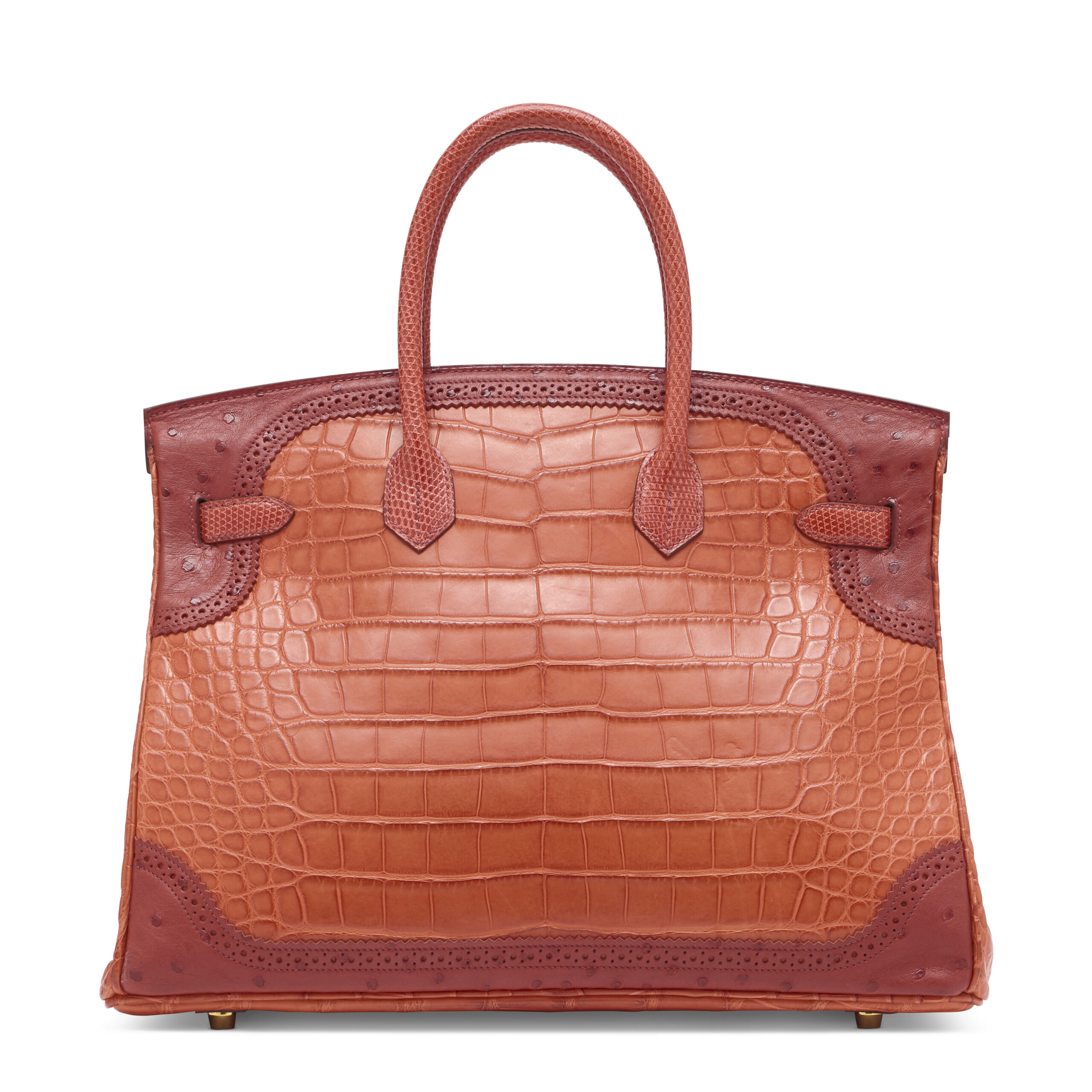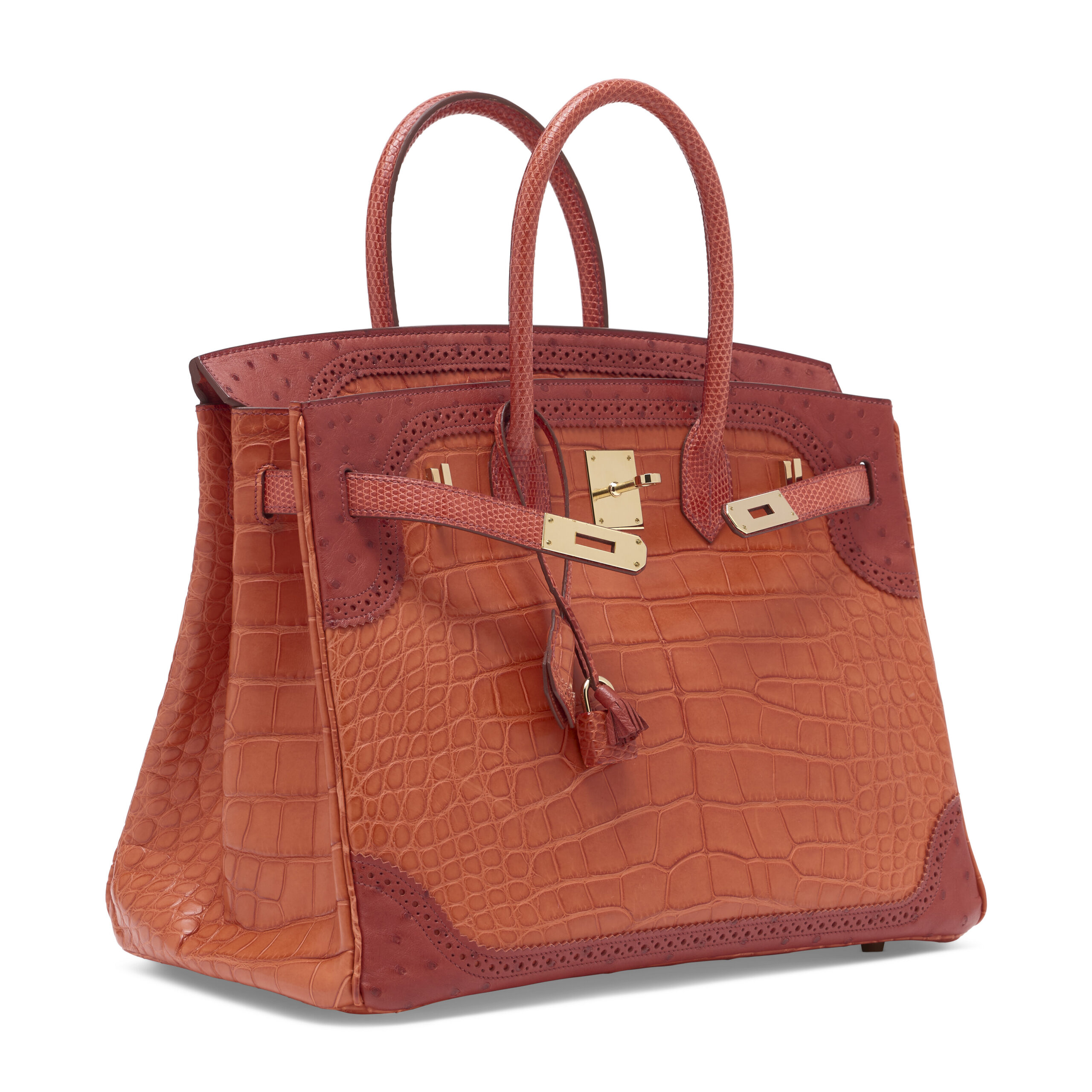 The “Grand Mariage” technique is a Hermès hallmark, celebrating the harmonious contrast of textures. This Birkin 35 masterfully unites three of the most coveted exotic materials, all dyed a deep, resonant matte sanguine—a rich, earthy red with profound warmth.
