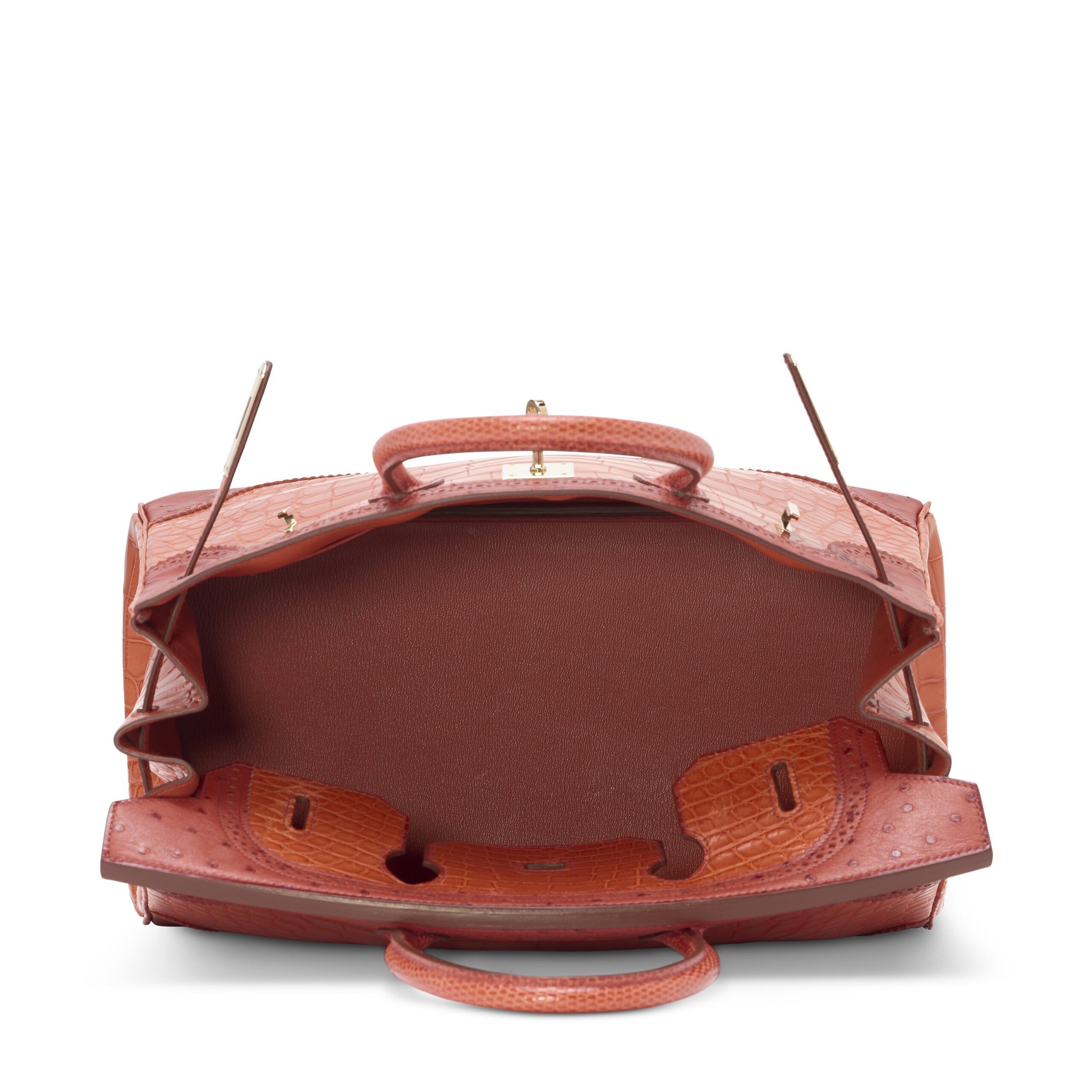 This Birkin 35 is distinguished by its use of Togo leather for its gussets and interior, a practical yet luxurious choice that provides structure and a soft, pebbled contrast to the exotics. It is meticulously accented with Permabrass hardware, Hermès’ proprietary brushed palladium-gold alloy. Unlike standard hardware, Permabrass develops a unique, warm patina over time, ensuring this piece ages gracefully and distinctly, telling the story of its journey.