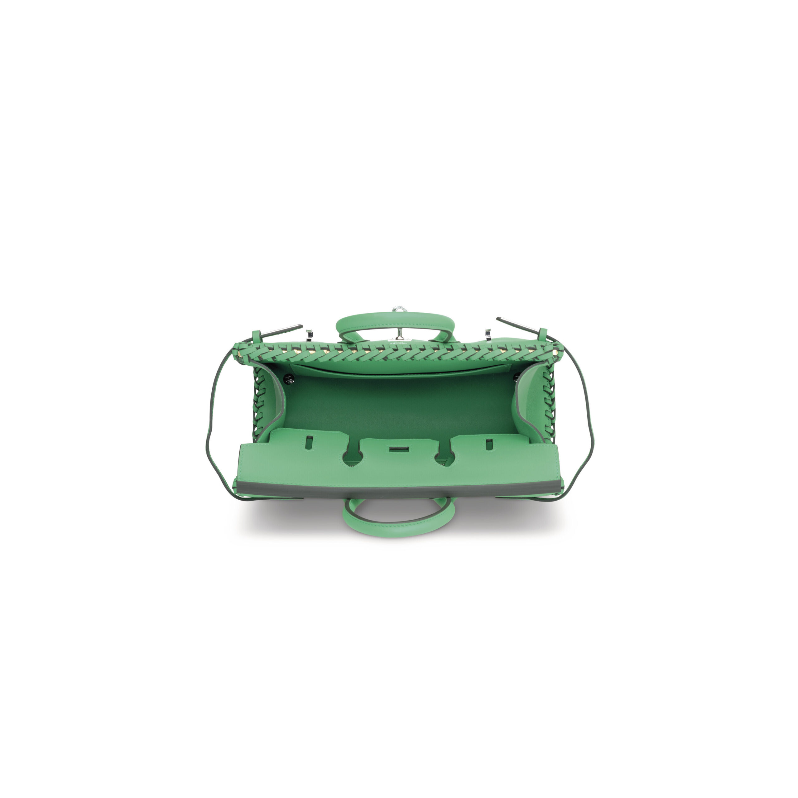 The heart of this bag’s allure lies in its contrasting yet harmonious materials. The sumptuous Menthe Swift leather provides a smooth, refined base with a delicate sheen, its soft green hue evoking freshness and sophistication. Interlaced with this is the authentic handwoven osier, a technique that requires hours of meticulous artistry by Hermès’ most skilled artisans. Each strand is placed with intention, creating a textured, basketweave effect that is both visually striking and incredibly tactile. The palladium hardware offers a sleek, modern contrast, its silvery-white tone complementing the Menthe leather perfectly, ensuring the hardware remains elegant without overpowering the design.