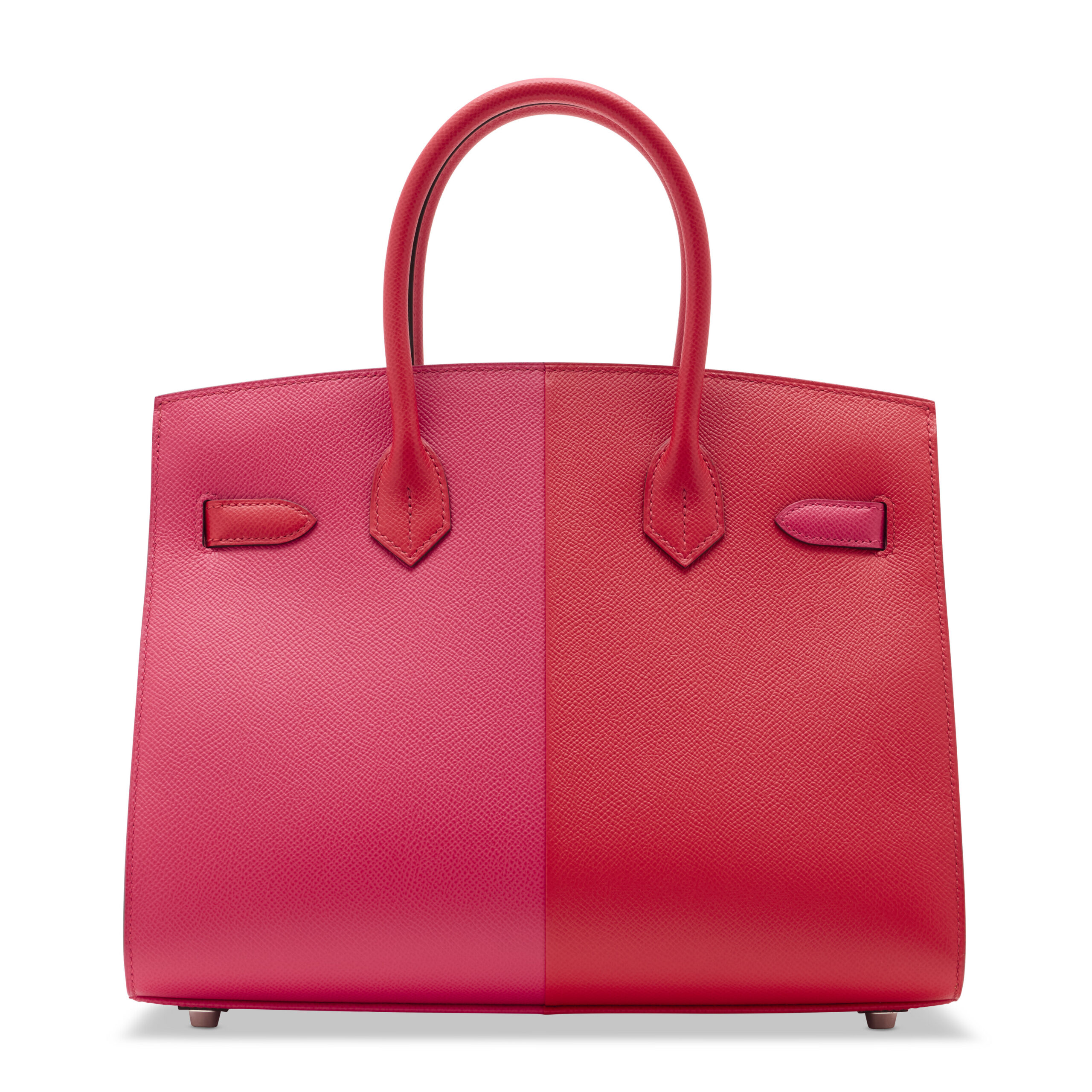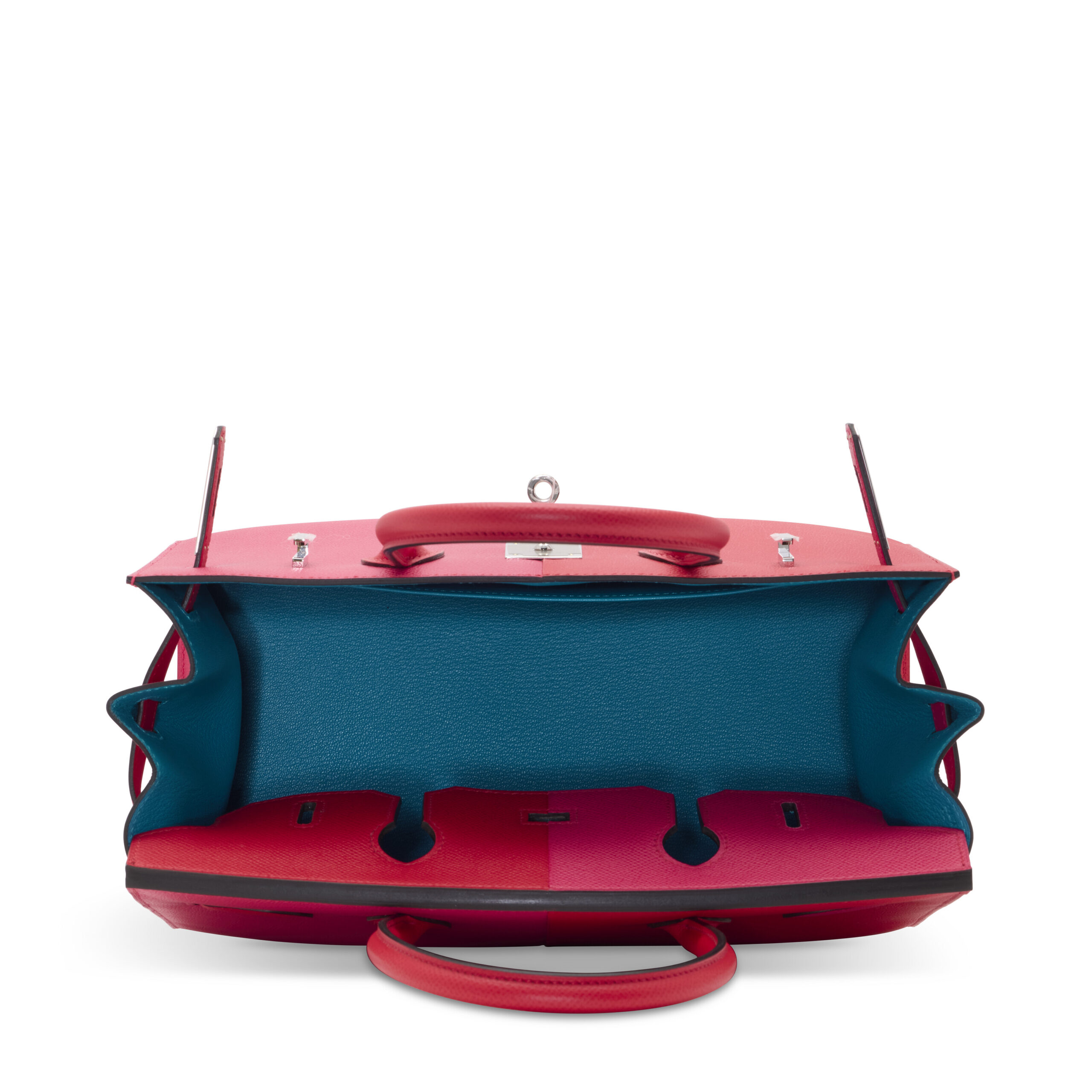 The tri-color Casaque design is a feat of precision leatherworking. Each panel—a bold block of captivating hue—is meticulously cut and joined with seamless intention. The Rouge de Coeur base grounds the piece in classic Hermès luxury, while the Rose Extrême and Bleu Zanzibar flaps and accents introduce a playful yet sophisticated modernity. The cool, silvery sheen of the Palladium hardware provides a flawless contrast, highlighting the clean lines of the sangles, plaque, and pieds (feet) without competing with the vibrant leather palette.