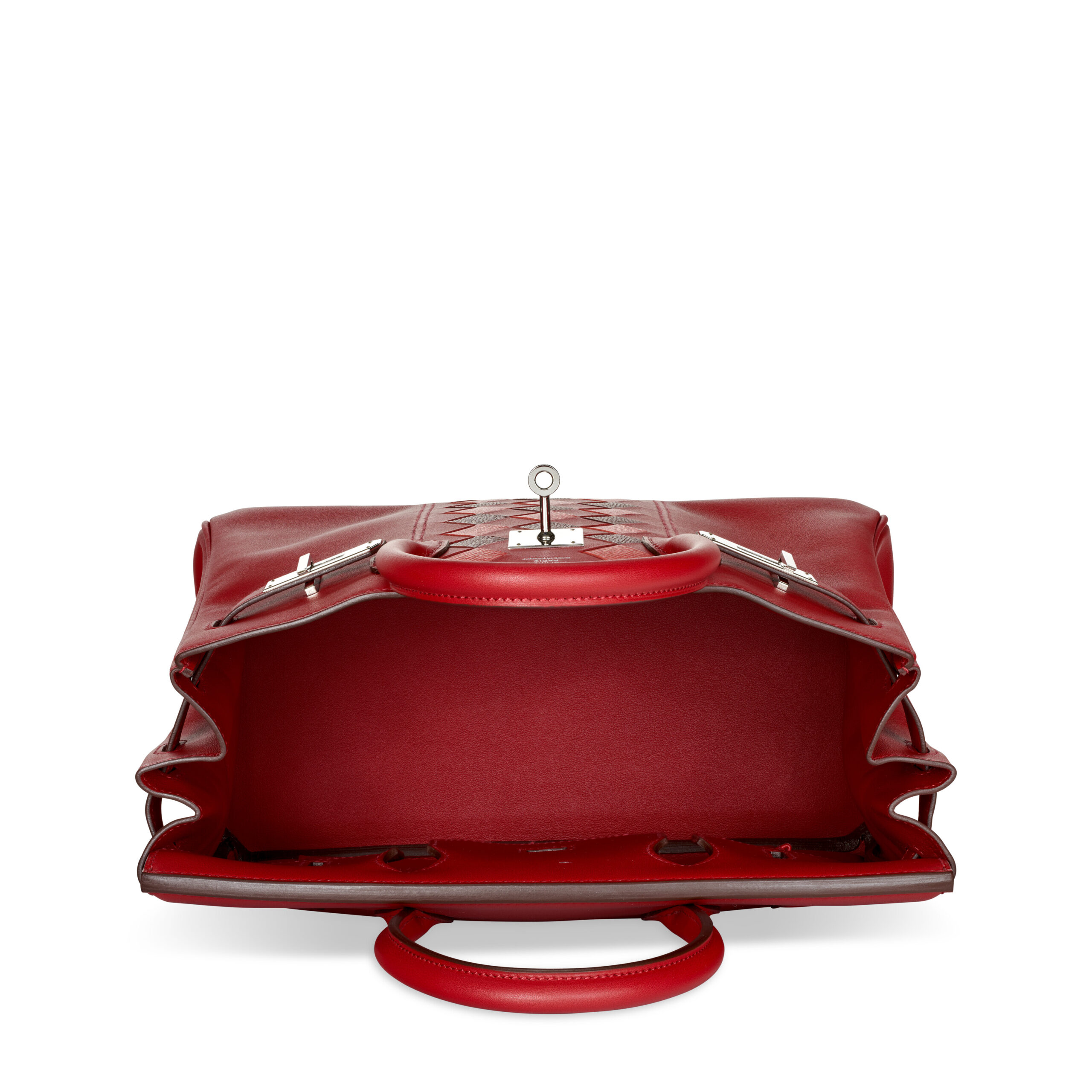 Crafted from the supple, fine-grained Swift leather and the structured, durable Epsom leather, this piece showcases a harmonious contrast that defines its unique character. The true marvel lies in the artisanal tressage—an intricate braiding technique performed by the most skilled artisans at the Hermès atelier. This meticulous handwork elegantly binds the three distinctive rouge hues, creating a dynamic, tactile border that frames the bag with unparalleled artistry. The cool, lustrous sheen of Palladium hardware provides a perfect, modern counterpoint to the warm, vibrant leathers, completing a look of sophisticated balance.