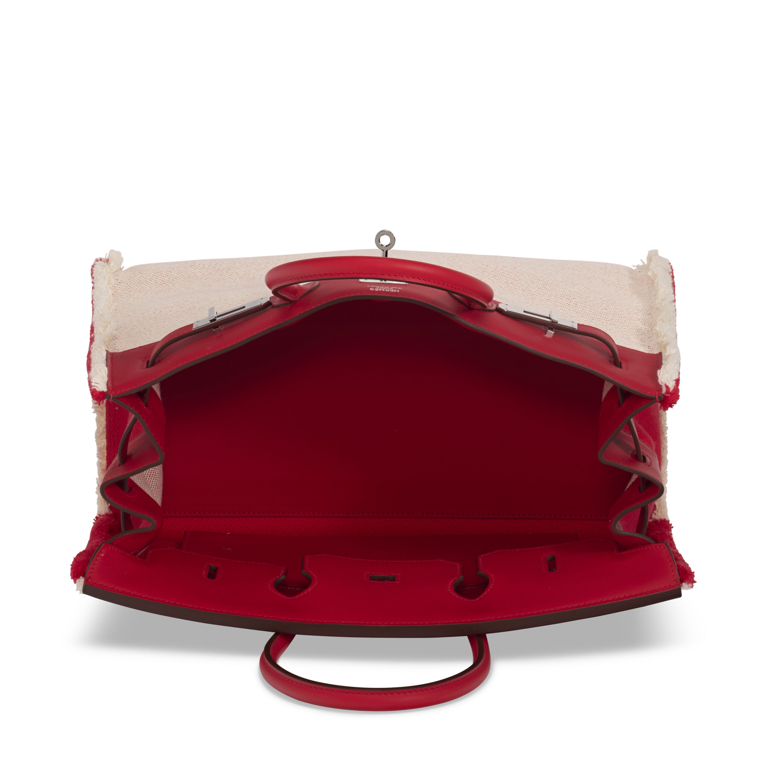 The soul of this Birkin lies in its masterful material dialogue. The sumptuous Swift leather in ‘Rouge de Coeur’ – a deep, passionate crimson – is celebrated for its supremely soft, fine-grained texture that develops a sublime patina over time. This lush leather is brilliantly paired with the resilient Twill H Canvas in a contrasting neutral tone, creating the iconic “Fray Fray” (or “Fray Fray”) pattern that signifies this rare series. The Sellier stitching technique, with its precise, external stitching, gives the bag a defined, architectural silhouette that stands proudly. Every stitch, every edge, speaks to the hand-stitched quality of a true Parisian craftsmanship heritage.