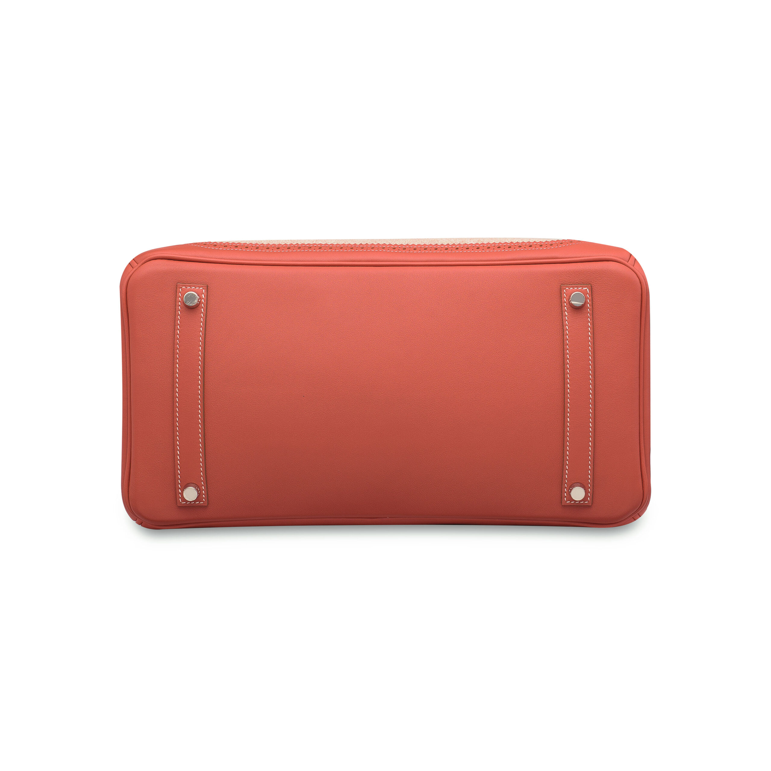 The bag’s body is crafted from supple Sanguine Swift leather, a prized Hermès material known for its fine grain, smooth touch, and rich color saturation. The warm, crimson-tinged hue is both bold and sophisticated. Contrasting the sleek leather are the structured side panels and base in durable, neutral Toile canvas, a material revered for its resilience and classic heritage feel. This intentional pairing showcases Hermès’ mastery of material juxtaposition, creating a piece that is visually arresting yet inherently practical.