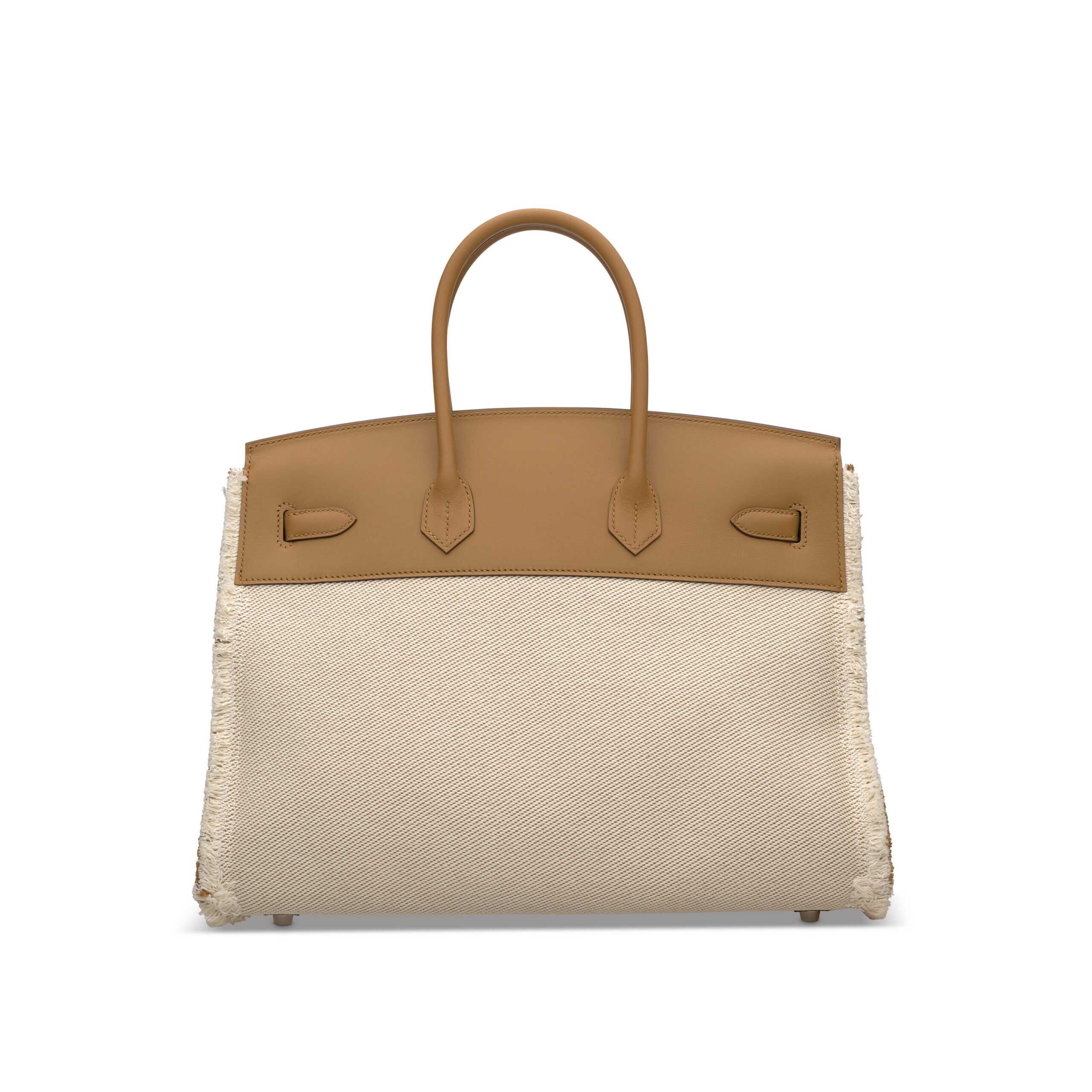 At its heart, this Birkin upholds the unimpeachable standards of Hermès. The primary body is crafted from supple Sesame Swift leather, a prized grained calfskin known for its silken touch and rich, creamy hue. Contrasting this luxurious smoothness are the strategic panels of iconic Twill H Canvas, deliberately frayed at the edges—the defining feature of the rare “Fray Fray” collection. This intentional unraveling is executed with precision, celebrating the raw beauty of the fabric’s weave. The entire ensemble is elegantly framed by sleek Palladium hardware, offering a cool, contemporary metallic sheen that complements the neutral palette perfectly.